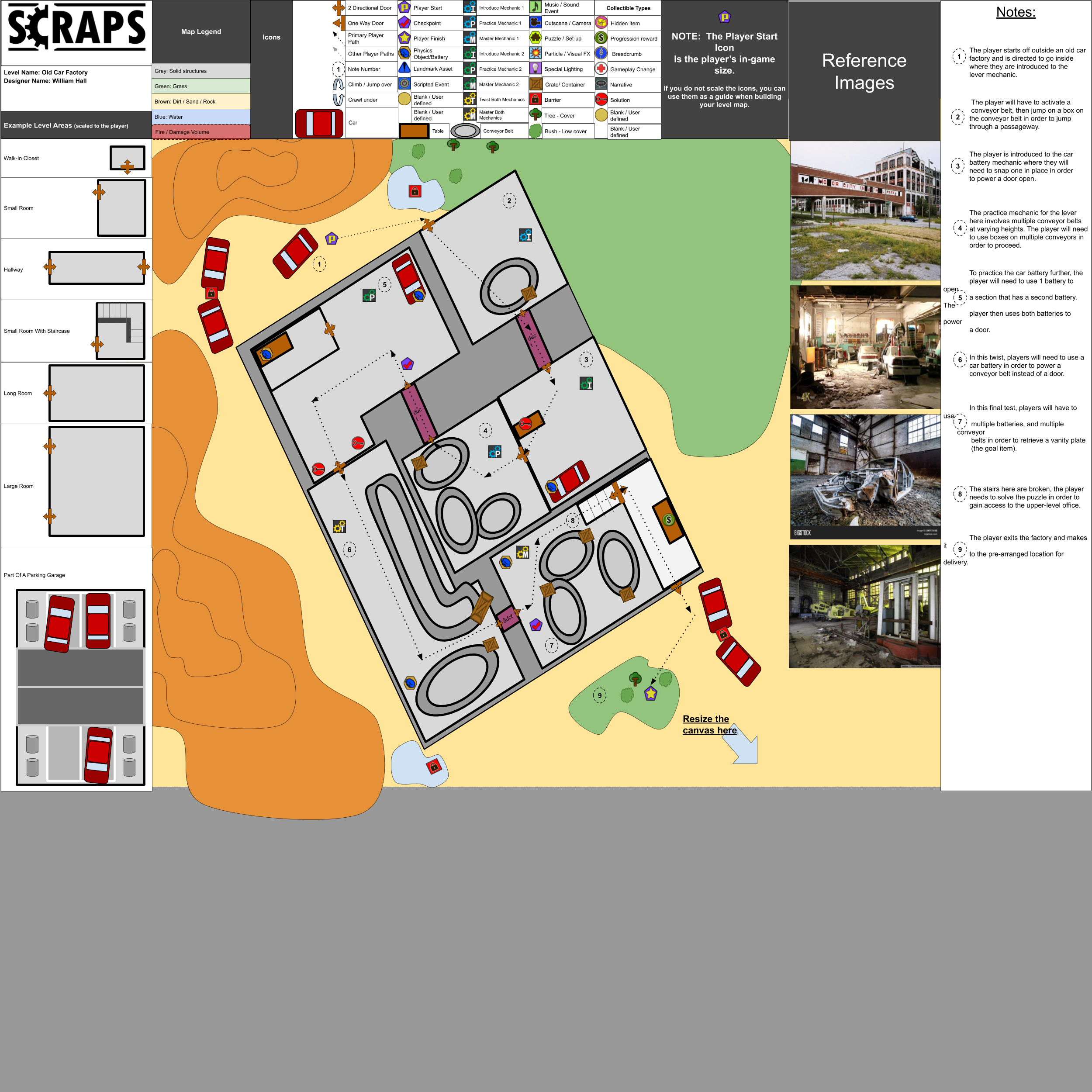 This is an image of the layout I designed for my level. It includes a basic overhead view of the level, along with a legend. It has icons for everything the player is expected to do throughout the level, reference images for artistic direction, and notes from me with more information about how to complete the level.