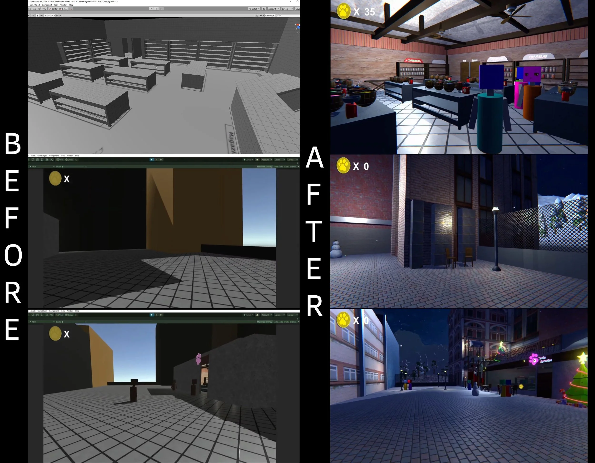 Here is a before and after shot of some of the spots in the scene. I love being able to see how a more realized scene looked when it was just starting out!